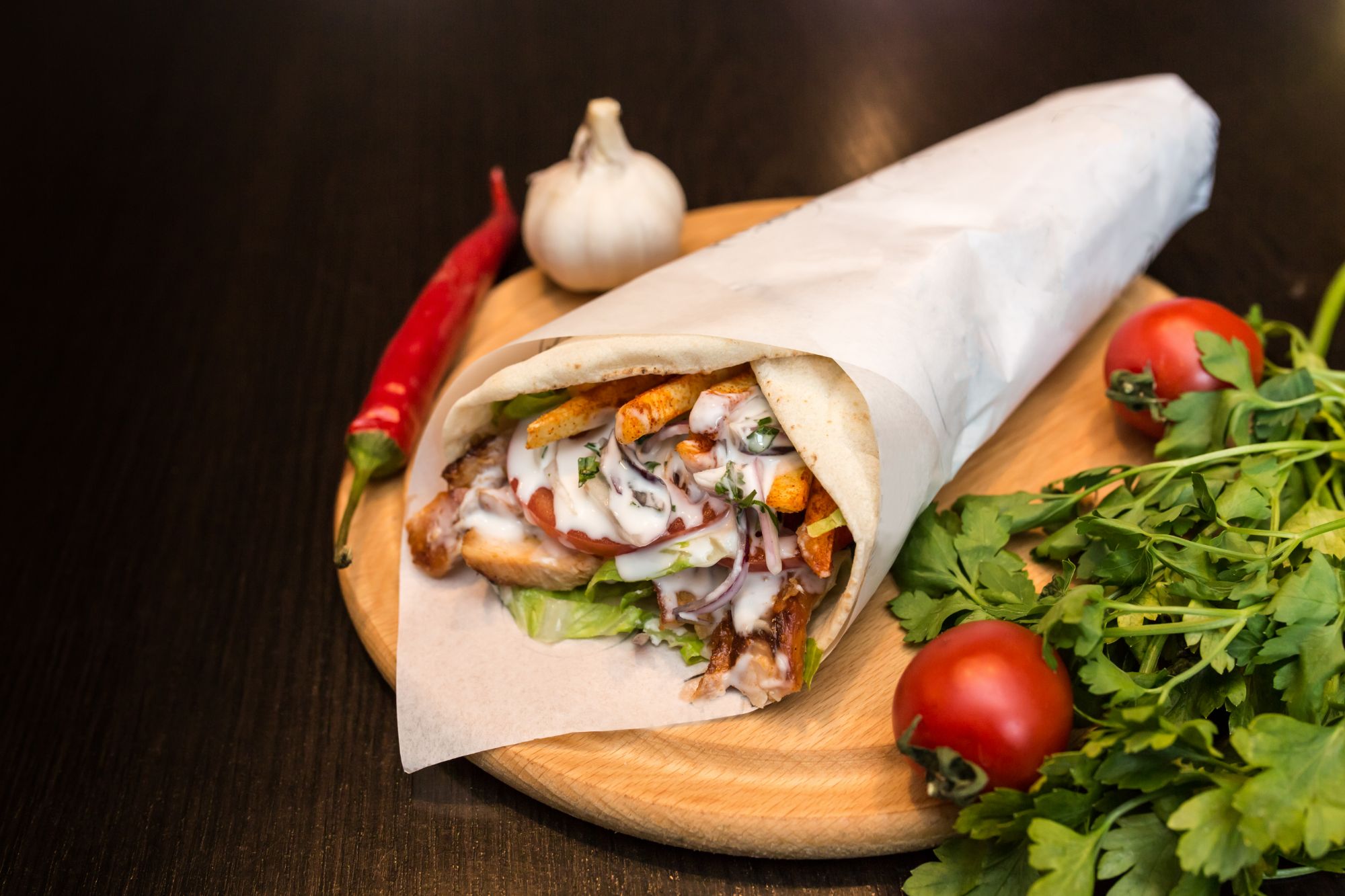 Cienki chleb pita, pieczone mięso, surówka, ogórek, pomidor, sos i pasta czosnkowa. Rozmiar, mięso i sos do wyboru. -